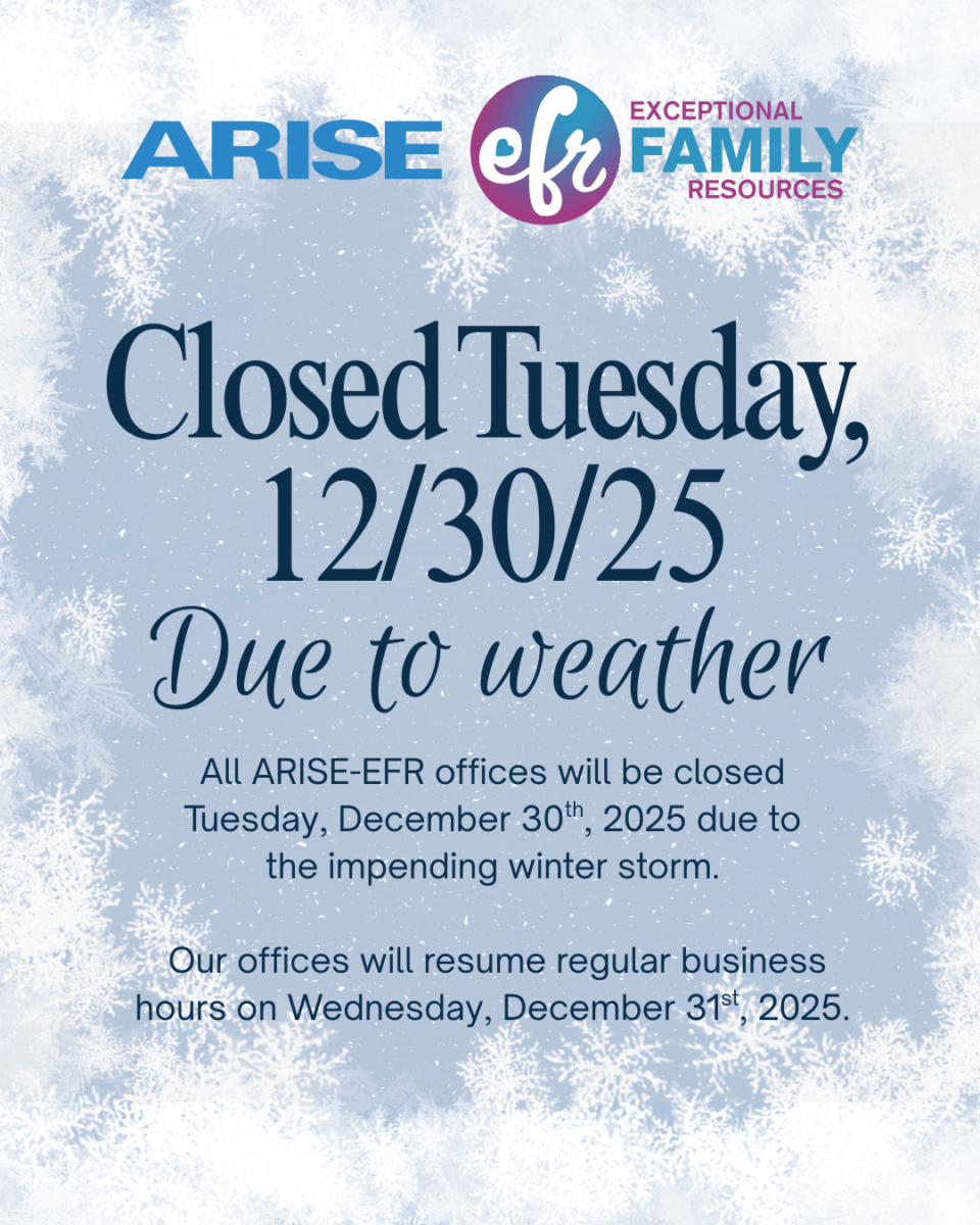 All ARISE-Exceptional Family Resources offices will be closed on Tuesday, December 30, 2025 due to the impending winter storm. We look forward to serving you when regular business hours resume on Wednesday, December 31, 2025.